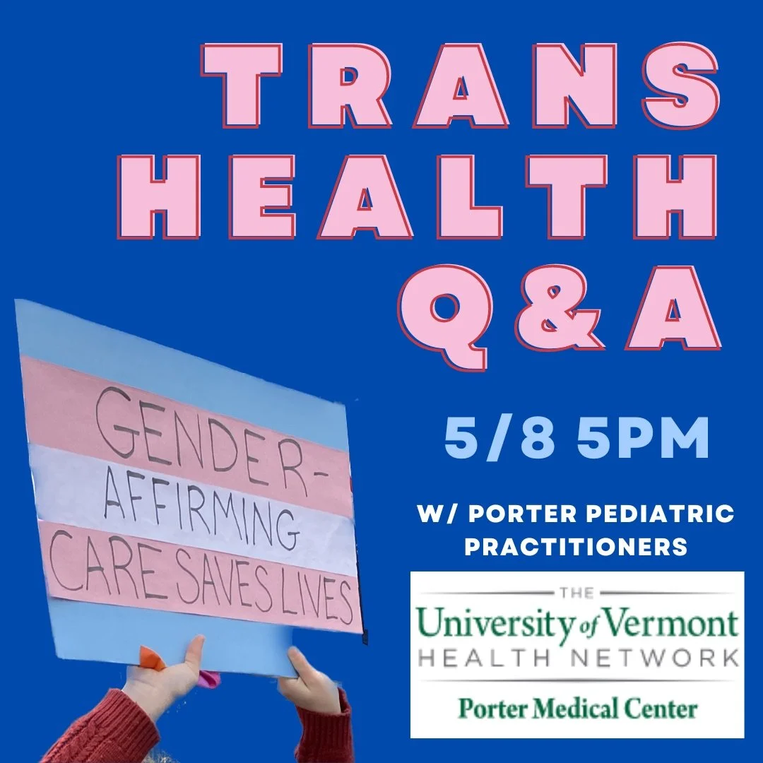 Pediatricians from Porter Medical Center will join The Teen Center during LGBTQIA+ group for a Trans Health Q&A! This is open to local queer and questioning youth. Please send questions to elio@teencentervt.org. Key questions and answers will be posted on Instagram after the event.